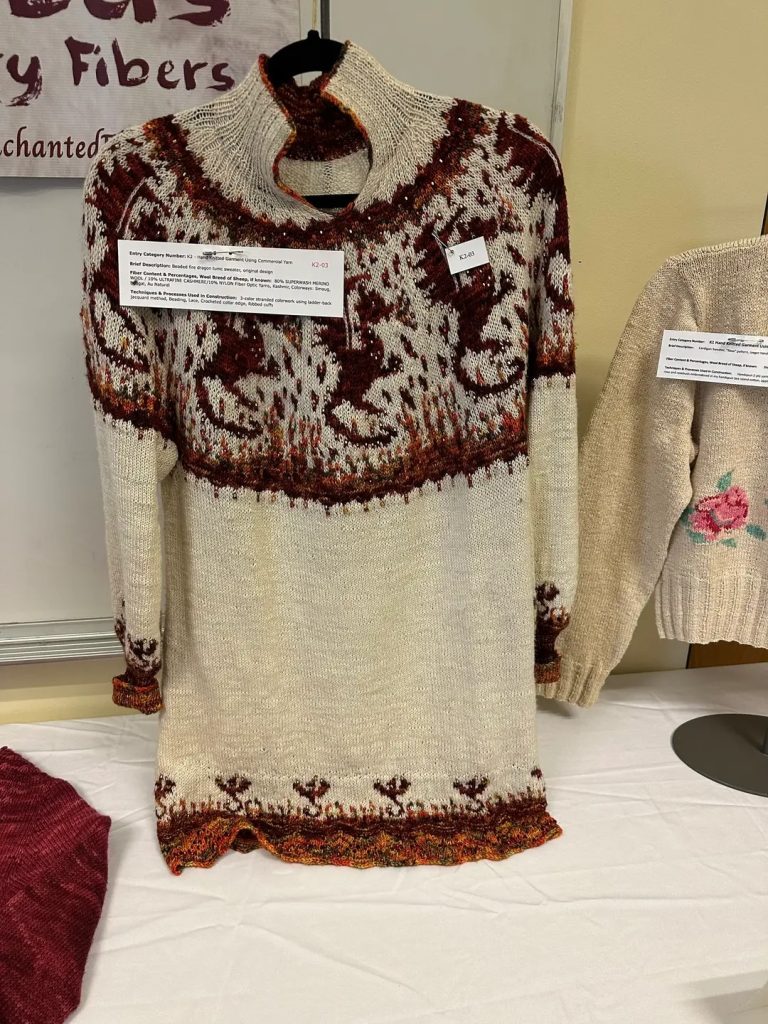 Karen submitted her fire dragon sweater and was absolutely robbed not to win an award. We think it’s her best work yet!