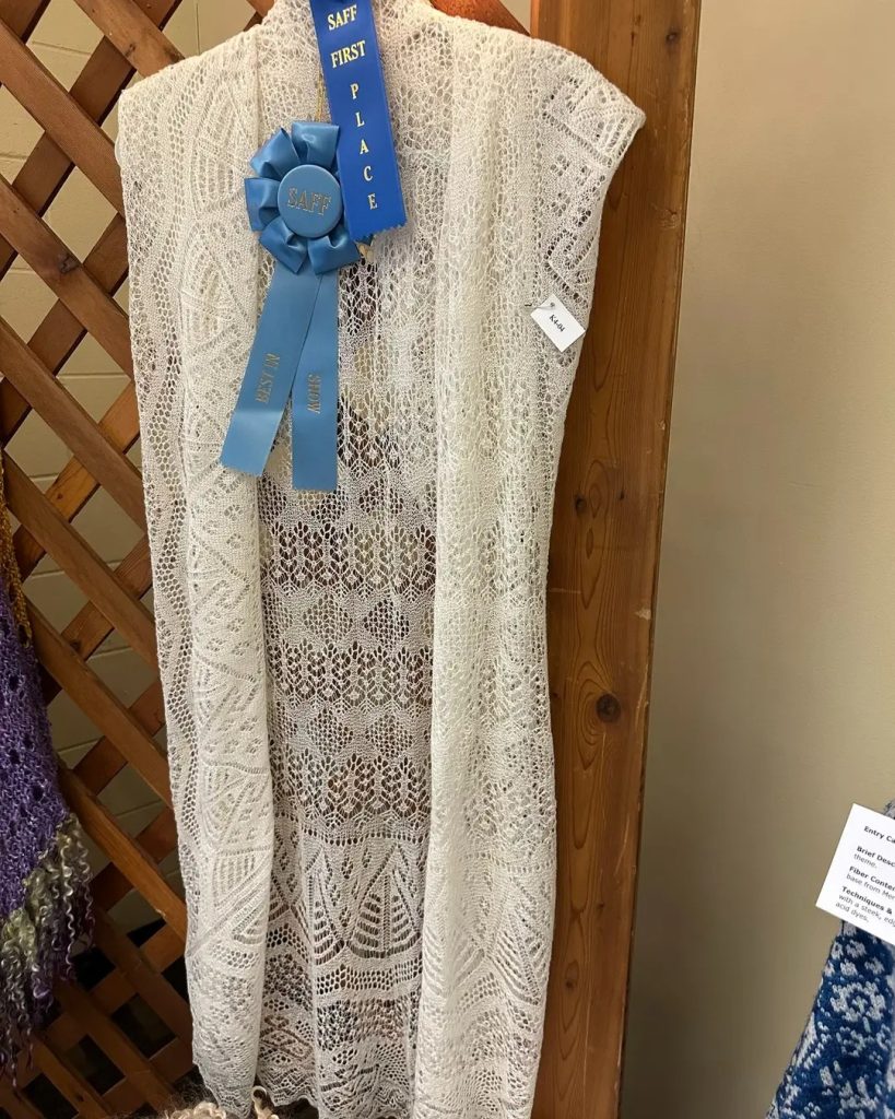 The Handknitted Scarf/Shawl/Wrap with Commercial Yarn Category was dominated by our Purl’s knitters. 1st was Ruth’s wedding-ring cobweb lace shawl. 2nd was Kim’s double knit Halloween kitty scarf. 3rd was Sara’s steeked stranded woodland creatures colorwork wrap. Amazing work all around! Ruth’s piece also took Best in Show.