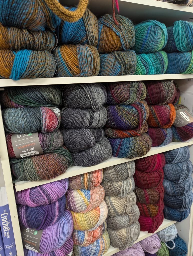 Just got a big shipment of Jody Long Colourspun: an easy-care wool/acrylic blend. One or two balls in enough for a project, $19 apiece. Let the yarn change color for you and keep warm through the weekend!
