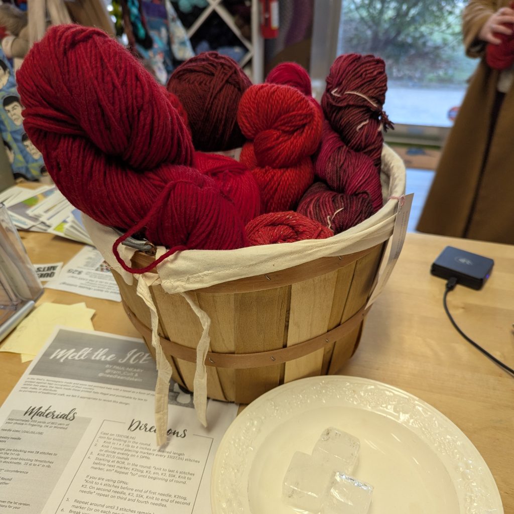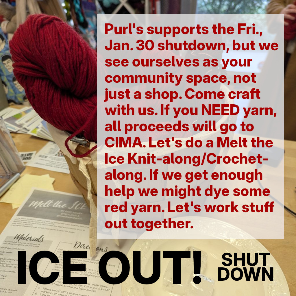 Join us for stitching together. If you need help with the Melt the Ice hat, come on by! If you’d like to try dyeing some red yarn, maybe we can do that too. If you absolutely need a tool or yarn to keep you going through the weekend, we can provide that, but all proceeds will be donated to our local immigrants’ rights group, CIMA. (Click the link to donate directly.)