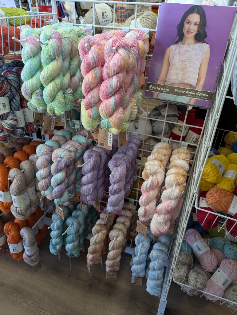 New yarn in the store: Araucanian Glisten. Cotton with lurex (sparkle!) in fingering weight.